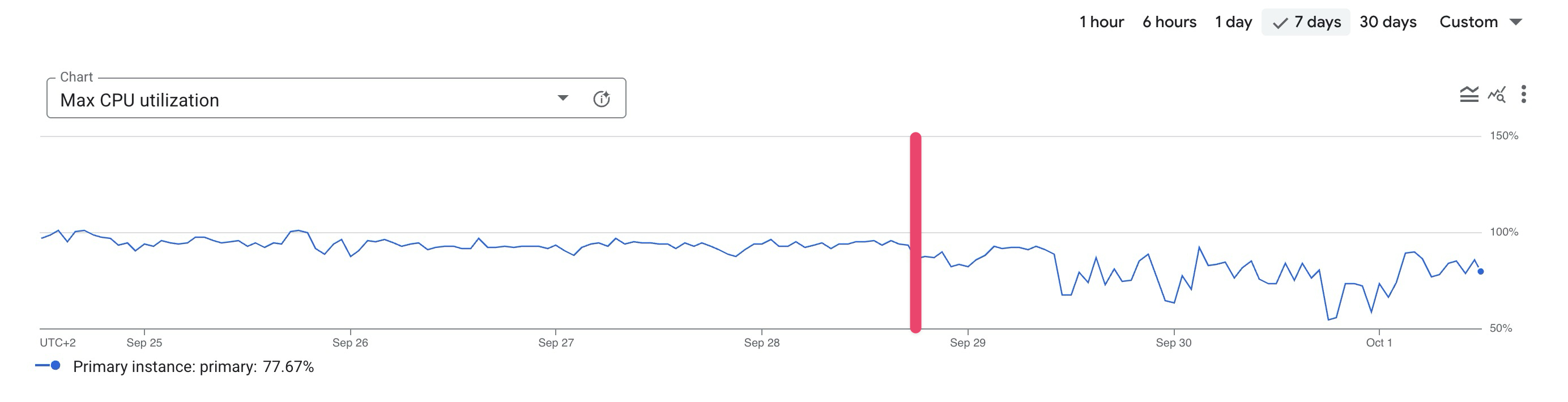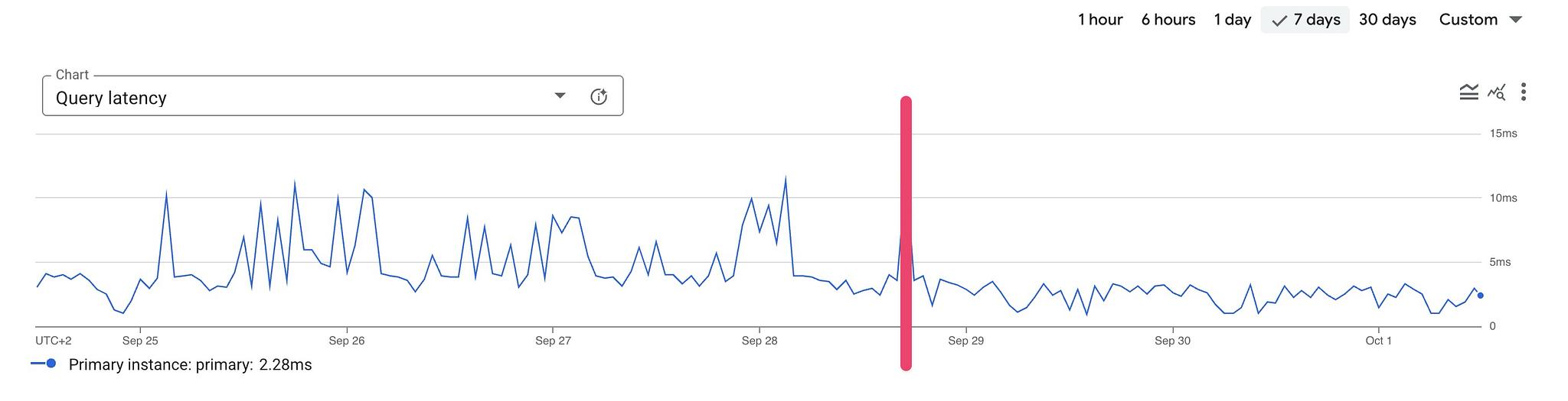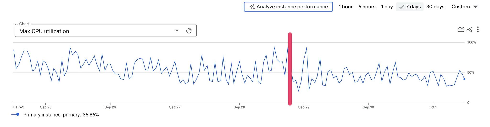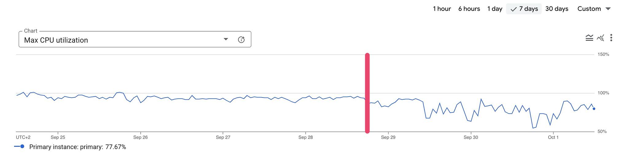 Results are less drastic. The database is heavily used but not as much as the previous one. Nevertheless, we can see the average CPU usage decrease, and query latency spikes are reduced as well.