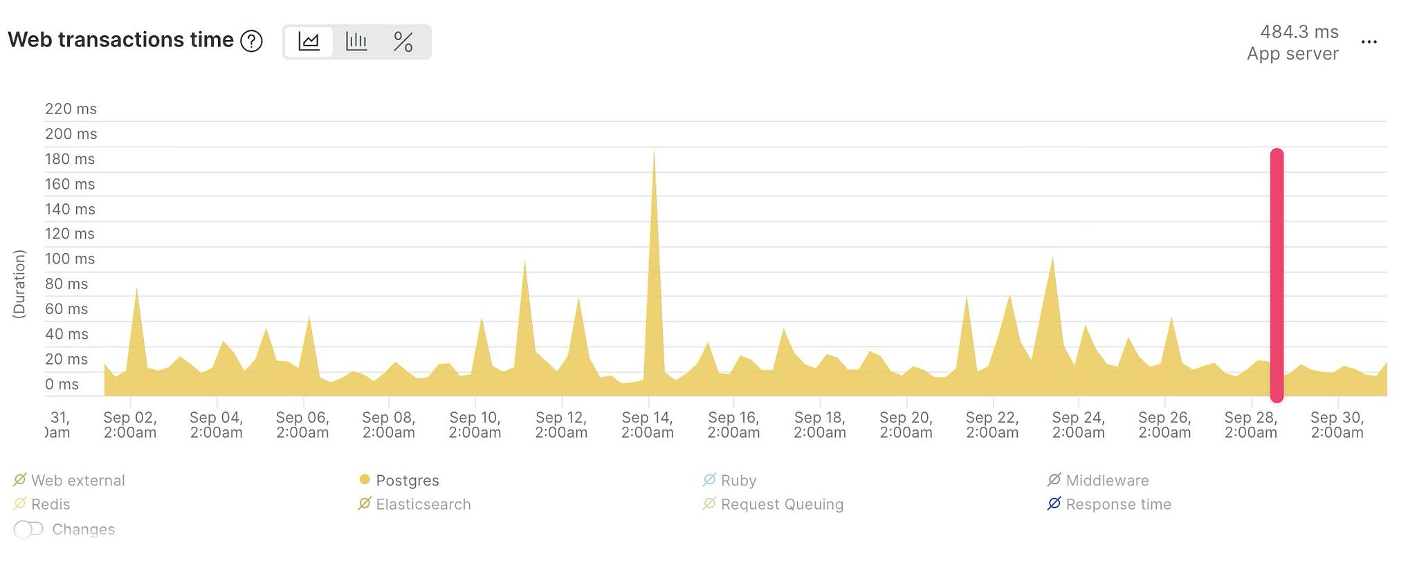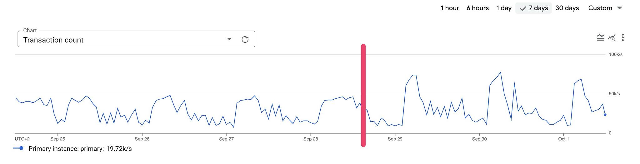 As you can see in the charts, the database load continuously hovered around 100%, and query latency would frequently spike. The database now has some breathing room, query latency is down, and peak requests per second increased by 50%.