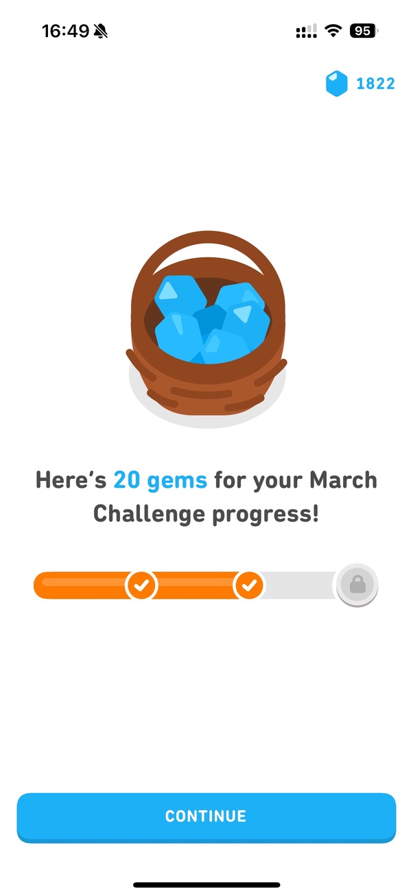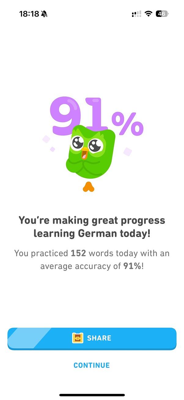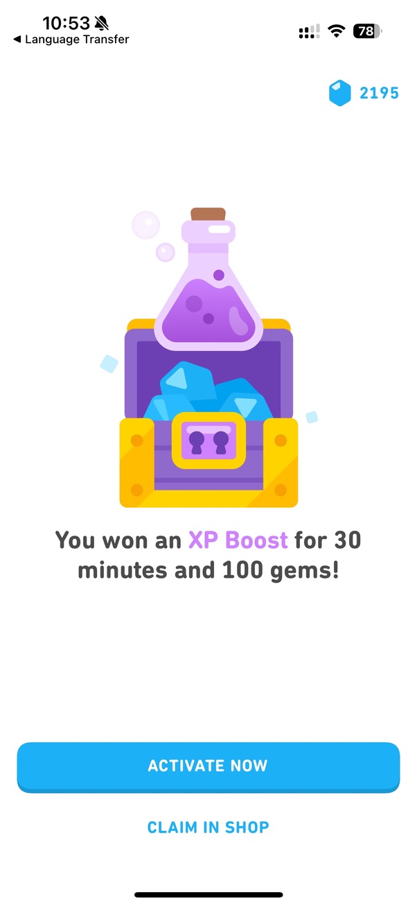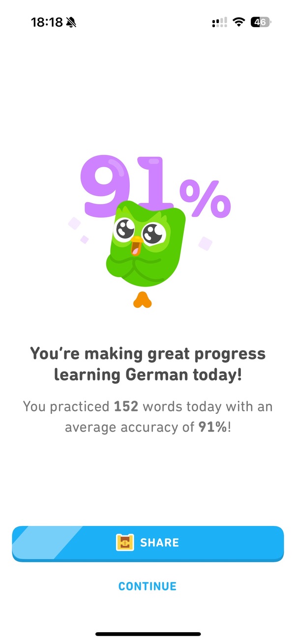 Duolingo is a fascinating app cleverly trying to trick you into learning a language. My wife and I have been playing around with it lately. I'll share how I think it can fit in a serious language learning project, but for the time being I wanted to share all the tricks I found Duolingo uses to keep you in their app. It's a bit of an interesting list as the same approaches would feel shameful coming from a mobile game trying to create addiction among its userbase. But the result of higher engagement on Duolingo is more language learning, so can we really get mad about it?*