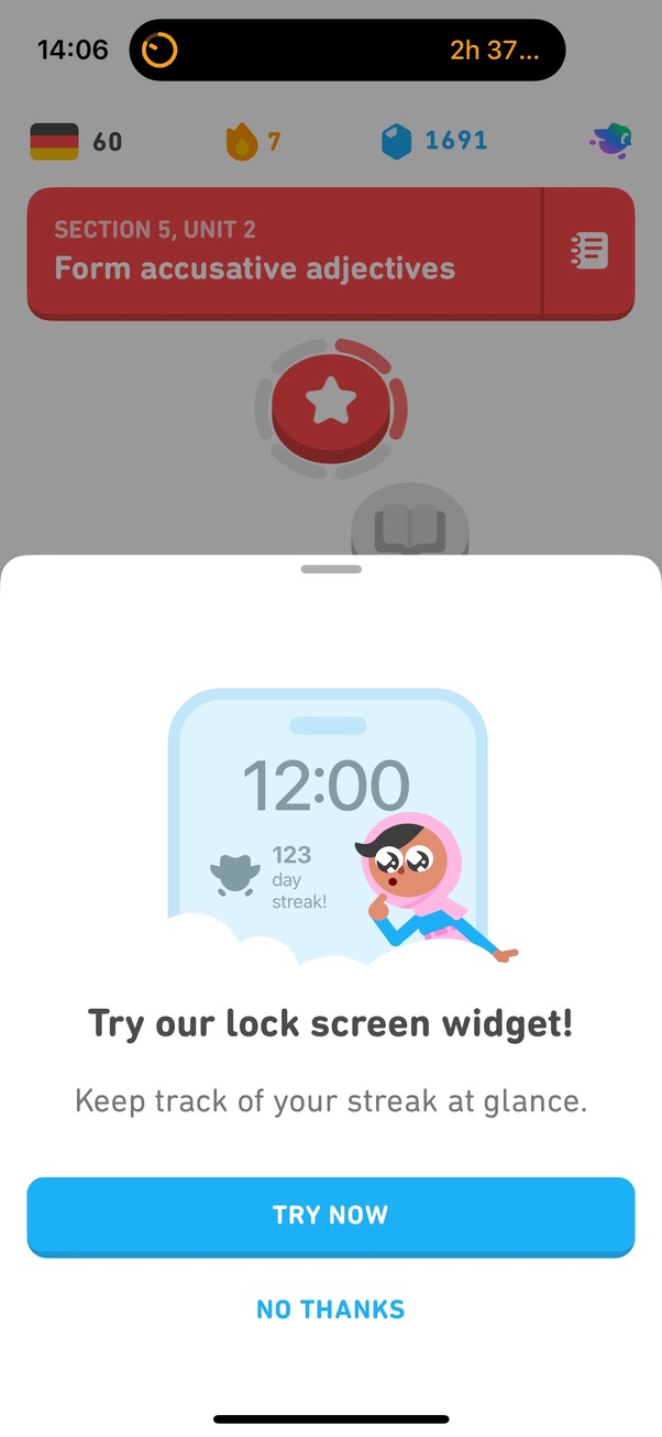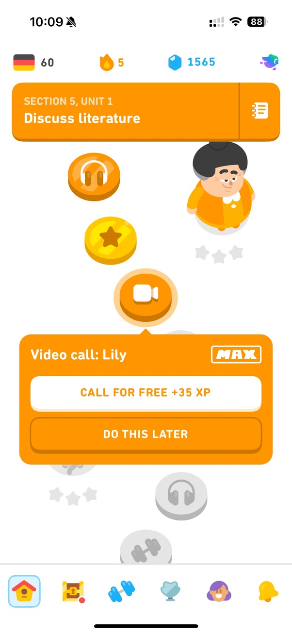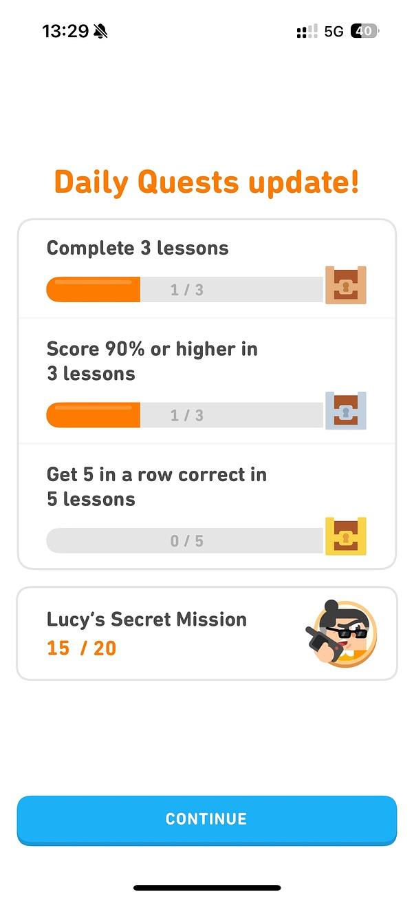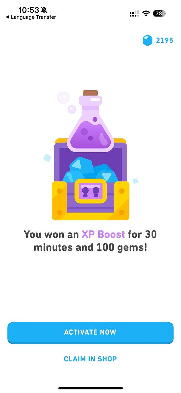 Duolingo is a fascinating app cleverly trying to trick you into learning a language. My wife and I have been playing around with it lately. I'll share how I think it can fit in a serious language learning project, but for the time being I wanted to share all the tricks I found Duolingo uses to keep you in their app. It's a bit of an interesting list as the same approaches would feel shameful coming from a mobile game trying to create addiction among its userbase. But the result of higher engagement on Duolingo is more language learning, so can we really get mad about it?*