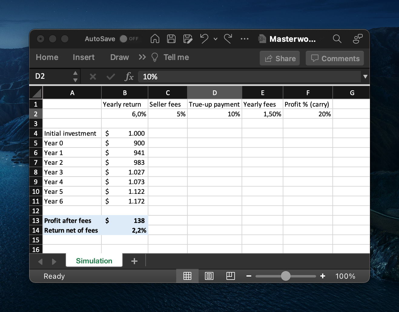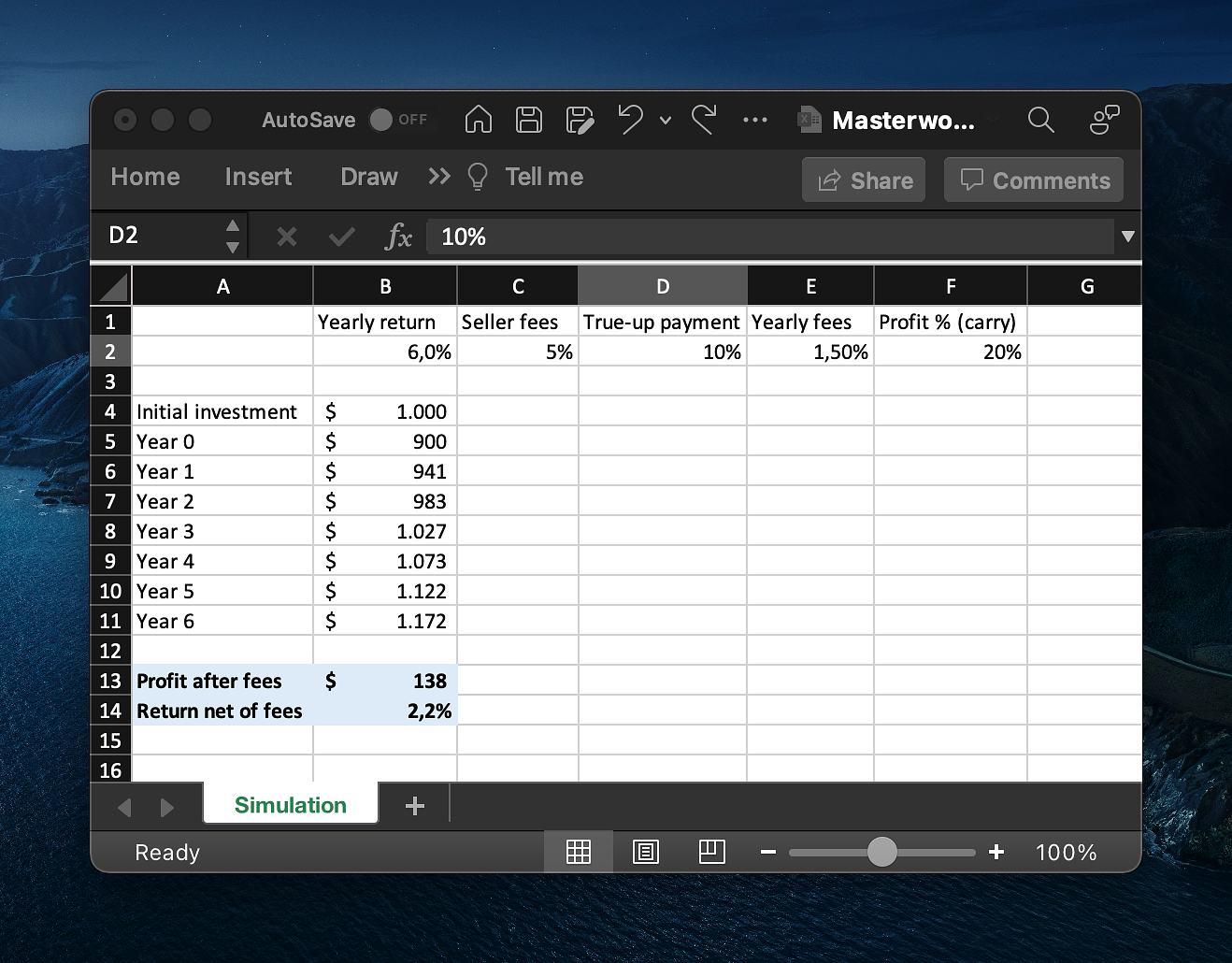 As we can see, with the optimistic yearly return of 13.6%, we arrive at a return net of fees of 8.5% before taxes. This is lower than the reference 9.5% S&P return. Things get even worse if the yearly return goes down. With a 6% yearly return and a holding period of 6 years, your return net of fees is only 2.2%. Those fees really add up!