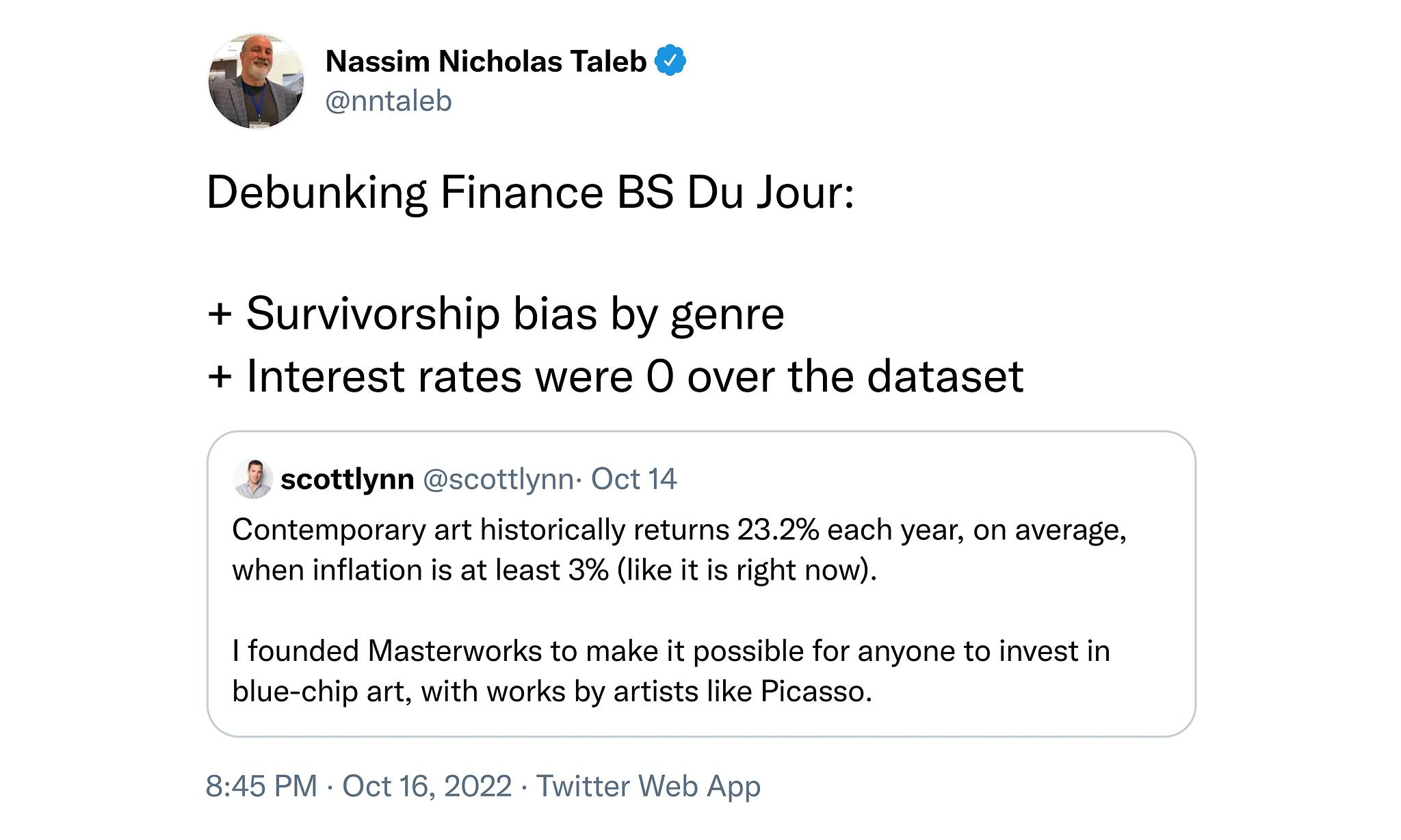 Nassim Nicholas Taleb made an additional interesting point: What makes contemporary art special? Why not invest in sculptures from the Renaissance? Or any other category of artwork? There does seem to be a selection bias at play here. Out of all the art categories, it’s expected that some would perform very well at any given time, but it doesn’t mean it will be maintained.