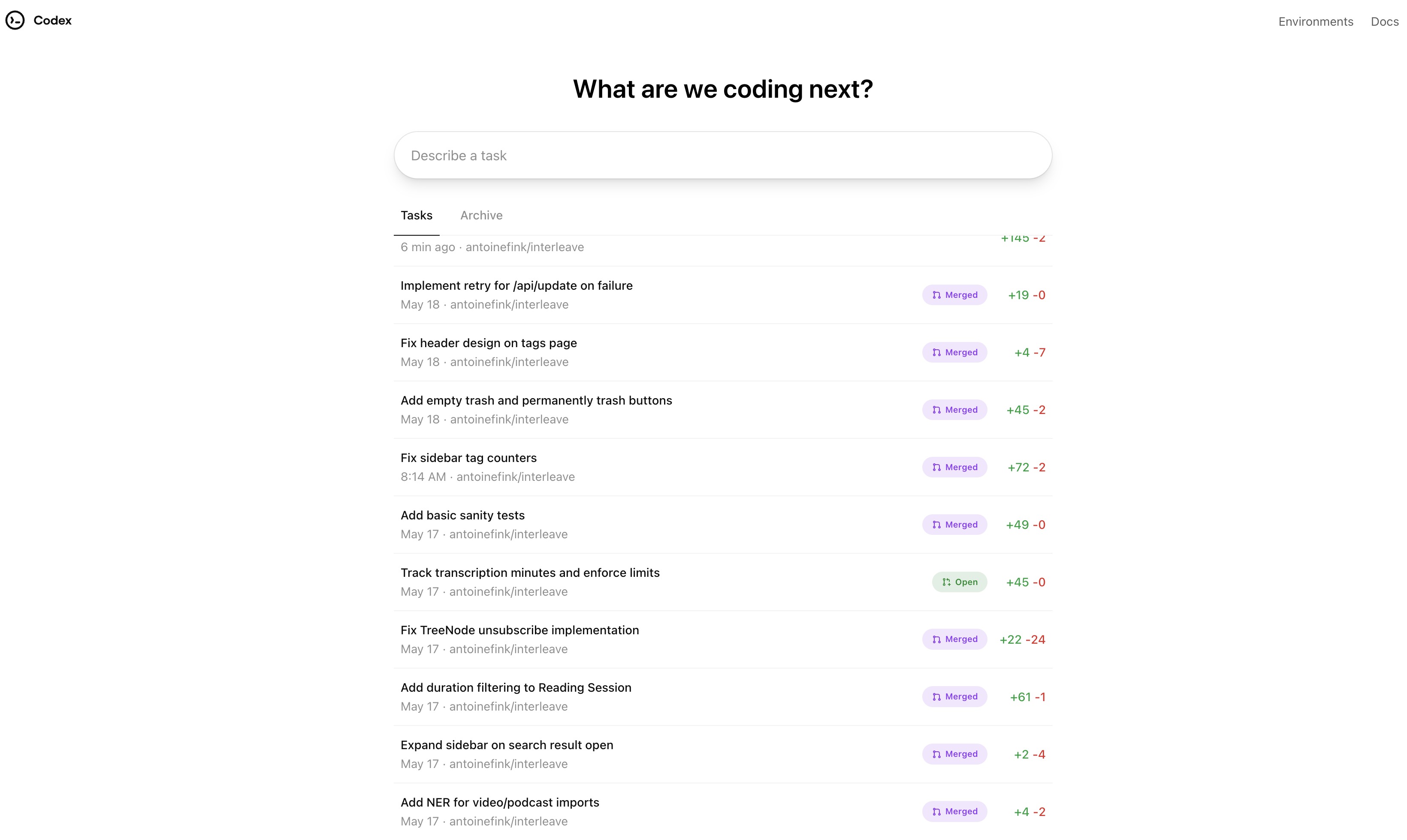 In this context, Codex can already do a lot. I did a small demo of my application the other day and noticed a few issues while doing it. Instead of taking care of them myself, I delegated them to Codex while I worked on more challenging tasks. Later on, I simply merged the PR after confirming the work was what I expected. These weren't complex tasks, but they still saved me some time. I expect that as Codex improves on all fronts, the complexity of tasks offloaded will increase as well.