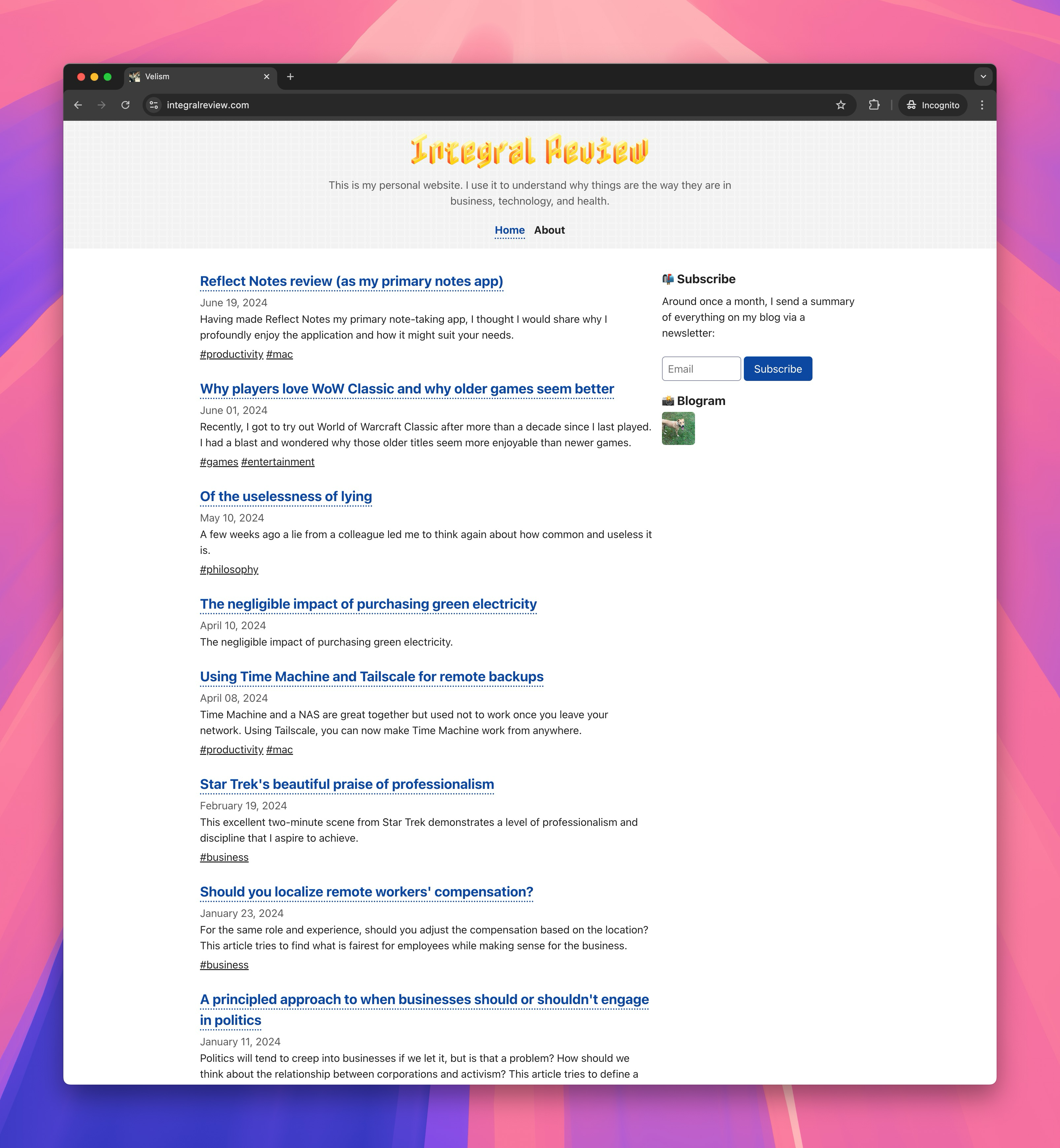 The idea came when my wife told me she wanted a place online to put some articles. I couldn't bear the idea of having to install a blog twice, which felt like a huge waste, so I built everything from scratch.