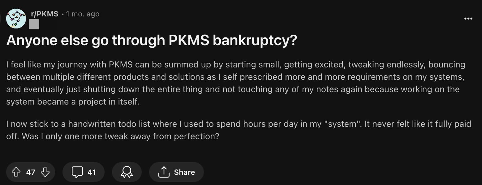 If you visit the PKMS community, you'll read about some declaring PKMS bankruptcy or describing complex workflows that they know will break as soon as they don't have time to keep them running. This is why it is common to go back to pen and paper. The natural constraints of this old-school system force the user to stop optimizing and actually start using it. Although I understand the appeal, our brains have inherent limitations that a digital application can help offset much more efficiently than a purely analog system.