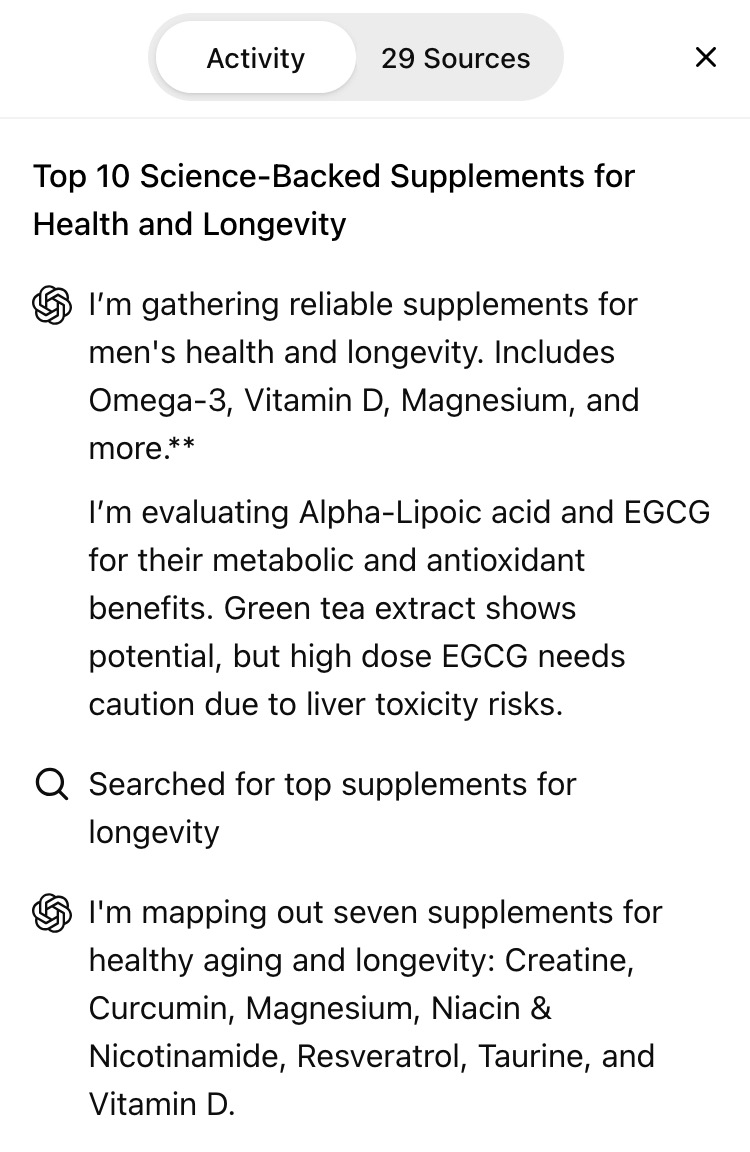 Another test query I did was ask for the best supplements one could take to optimize for general health and longevity. I thought this would be an interesting query as it is a very broad topic, with lots of noise, and commercial interests. Here is the full output.