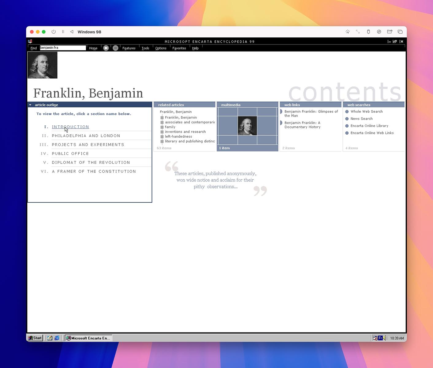 Windows 98 uses a different processor architecture compared to modern Macs, so we'll need to use software to emulate an older environment. There are both paid and free options available. From my testing, nothing is perfect as there are no more commercial use-cases for running these older operating systems. Nevertheless, there are communities still working on improving compatibility to this day.